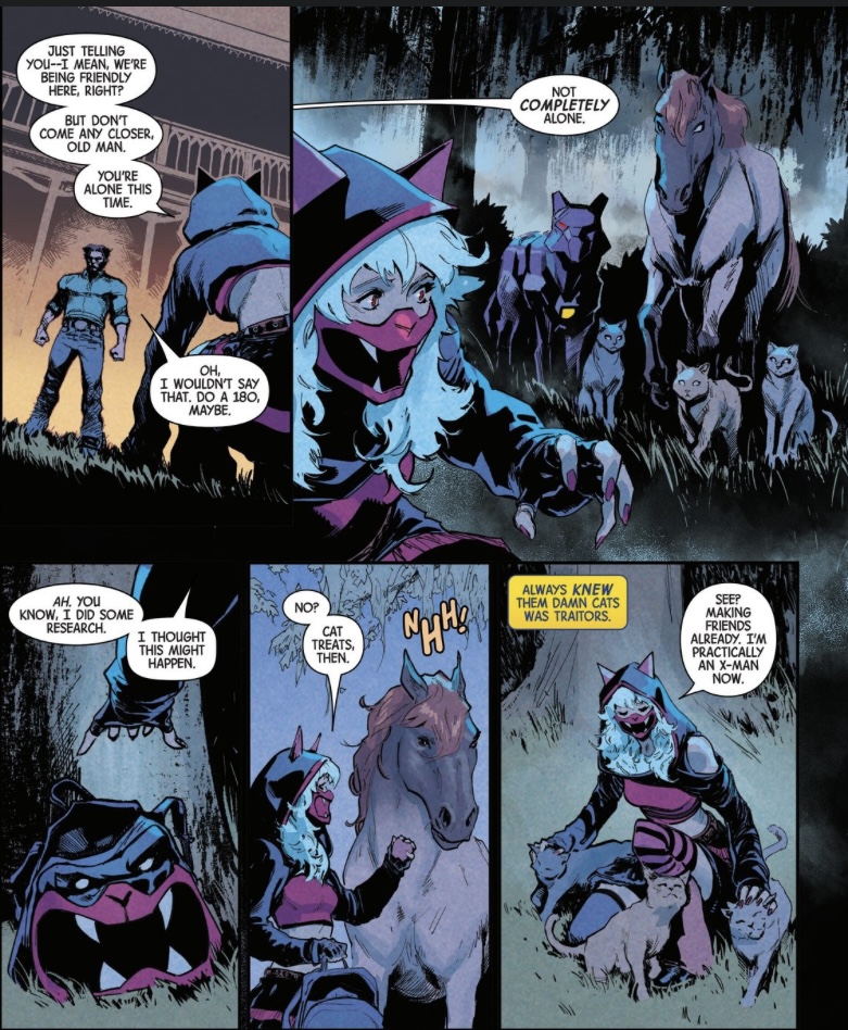 As Logan is confronting her, nearly the full cast of The X-Pets comes out. Ember, the dog shaped Sentinel, all of Gambit’s cats. Mutina tries to feed good boy, Ember, but he doesn’t want her food. The cats literally eat up the cat food she brought for them.