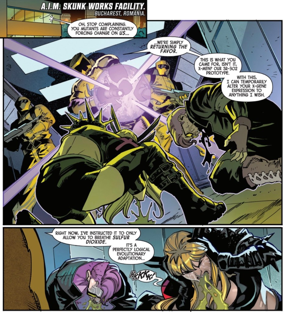 Magik and Quinten Quire start out throwing up as a jerk AIM agent change their biological make up to only breathe sulfur dioxide. Cyclops comes in, optic blasts everybody, so we see how cool he is.