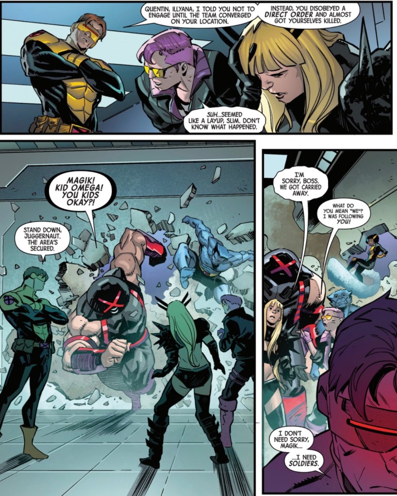 I don’t love that he chastises Magik & Quire, nor that he is looking for soldiers, that doesn’t seem to be his relationship with Magik or Quire. He must be just hyper focused right now.