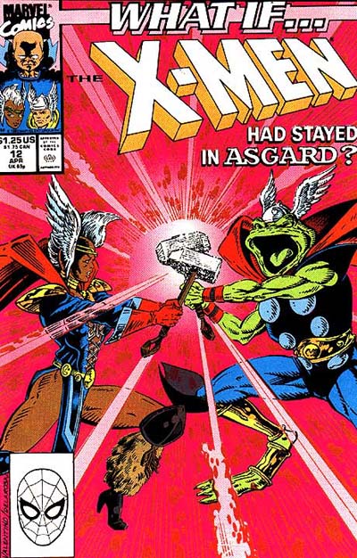 While Loki is making a speech, this giant six foot six inch frog tackles him! Loki makes it so Frog Thor can’t speak, and makes Storm battle hungry. This is shown, artistically, via Loki’s bald bald. Which I haven’t thought of him as being bald. Also, we see the reverse of the cover’s image.