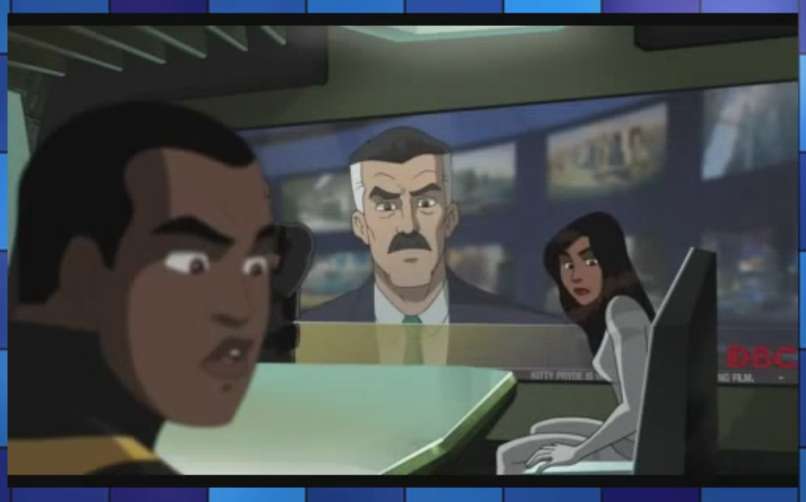 The X-Men are apparently coming to Ultimate Spider-Man at some point in season three. I read that Kitty Pryde was mention once as to existing in this universe. Doing a little research revealed that she is named in the Daily Bugle news tickler to be appearing in an upcoming movie. This happens at the 2:07 minute mark of the episode. You will need to enlarge the video and then pause it as soon as Peter falls out of his chair. Her name isn’t on the screen for long.