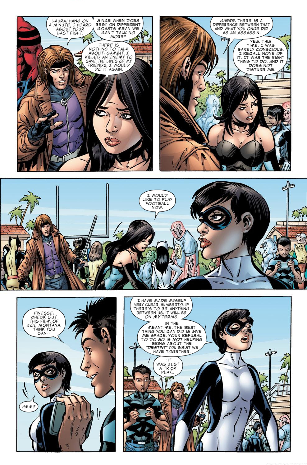 Reptil (so that they can copyright it, perhaps?) – who is nothing like his Super Hero Squad persona, wants to talk to Finesse. Reptil has the powers of the past but is also from the future – if I’m understanding this correctly. Apparently he has also reveal to her that they are future lovers but she is dealing with her inner struggle (the best kind!) about coming clean to X23. All he wanted was to get her opinion on a football play by Joe Montana. I believe Finesse has the same powerset that Taskmaster has.