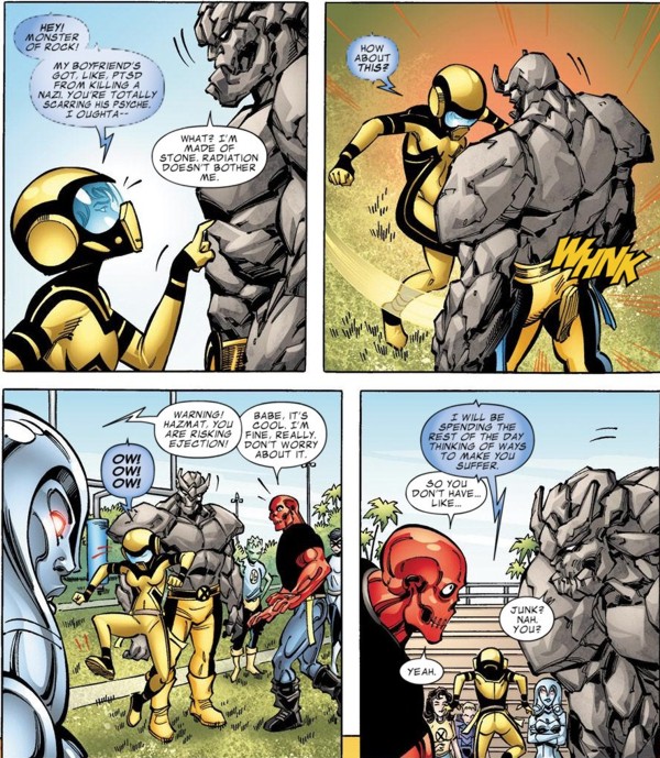 Mettle runs off and Hazmat, his would be girlfriend, tells Rockslide off. Mettle is dealing with PTSD (from killing a Nazi, something I believe I could handle with no ill effects) and doesn’t need additional trauma being added to his already full plate. Hazmat attempts to kick Rockslide’s rocky balls but he doesn’t have any. Even if he did, he is made of rocks, and that would have hurt Hazmat regardless. Plus, he’s made of sharp rocks, she is risking tearing her radiation suits, thus risking exposing all of the people on the field to radiation poisoning. Hence, why Osborn thought she would make an amazing villain.