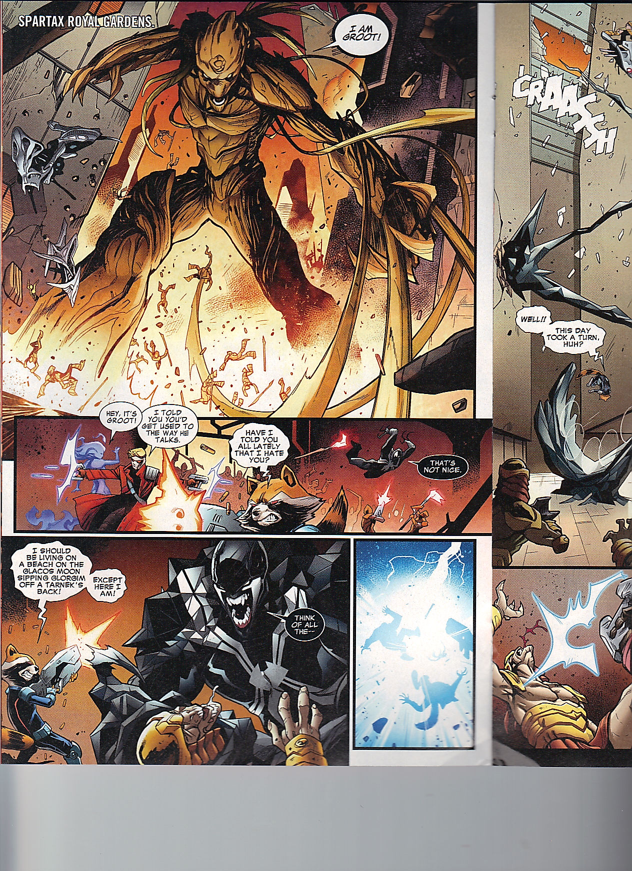 Spartax. The issue opens with Quill shouting that the delegates need to get to safety. Rocket can’t believe that crazy has followed Quill to his home planet.