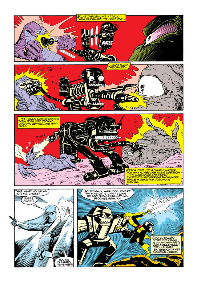 He turns two of the demons into techno-organic matter, so that he can absorb them, properly. Magik knows that this is her fate, if Warlock has his way. But she governs this realm, and can do anything she desires. I like how she refers to it as “my magick is law” does she pronounce it with a very hard k?