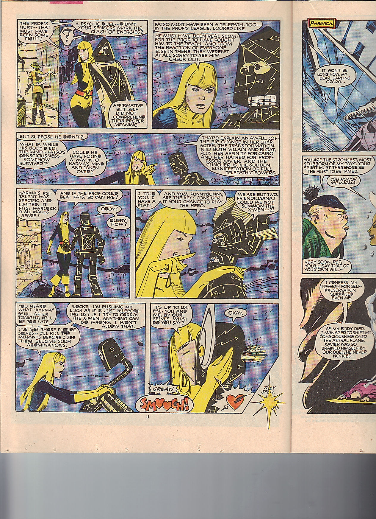 During Shadow Karma’s big speech, Illyana interrupts, like a boss! One can’t merely lock a door, against a teleporter. Magik wants to be Shadow Karma’s partner. S/he wants to seal the deal with a kiss.
