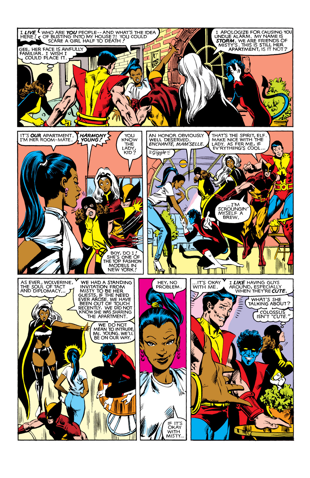 Harmony finds the guys to be cute. Kitty thinks to herself that Colossus isn’t cute.