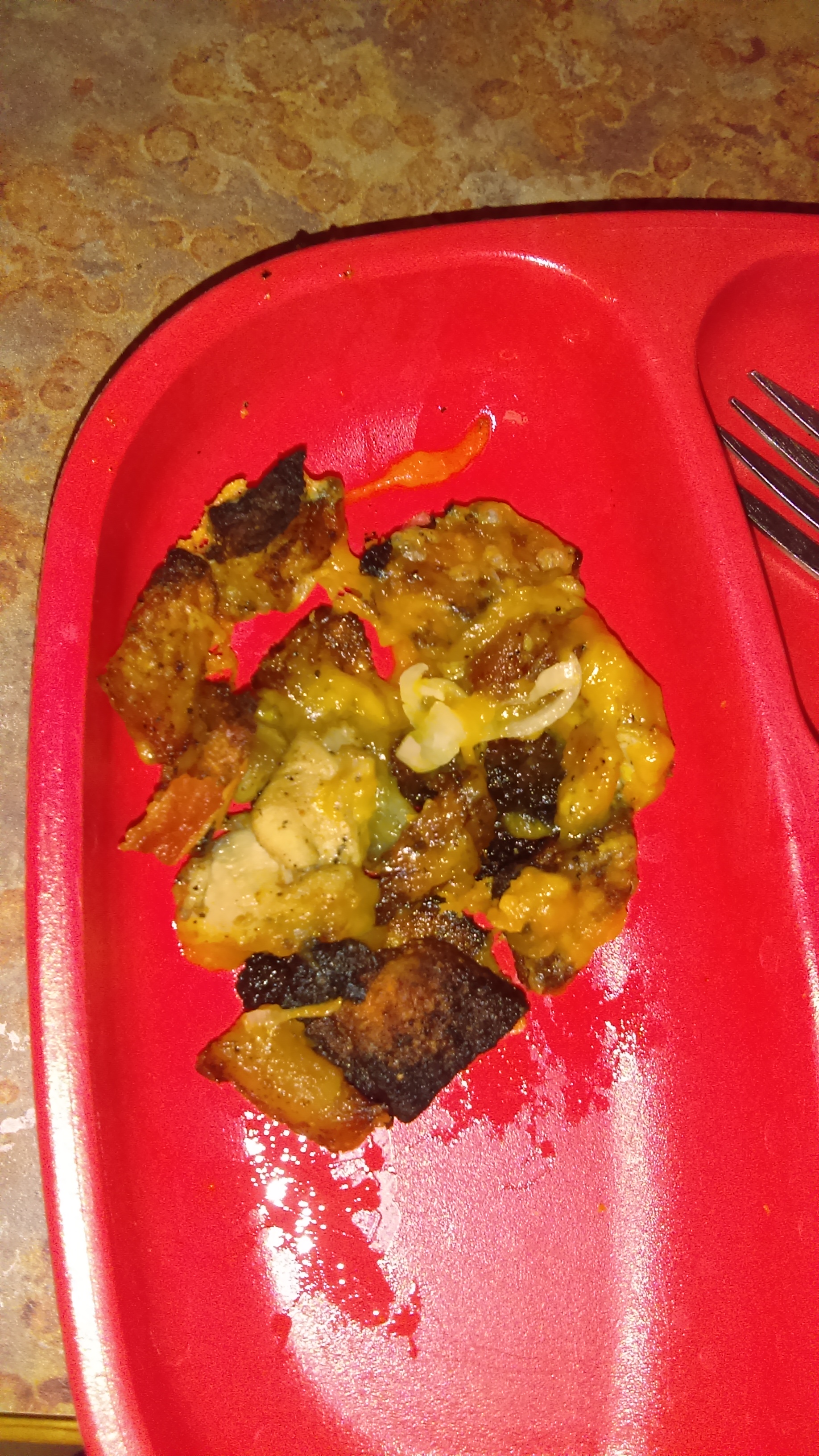 I will also cut down the chicken baking for 12 minutes and modify that to six minutes. That’s what I should have done last night, but I went against my better judgment and my instincts. I think I’m at the point now when I have to trust my cooking instincts. The potatoes around the edges were pretty badly burnt but there were some in the middle that were pretty tasty. This entire meal had a pretty nice spice to it. I figured it was going to with the three tablespoons of hot sauce, I went with Cholulua brand of hot sauce. It was that or Tabasco but I prefer Cholulua, myself.