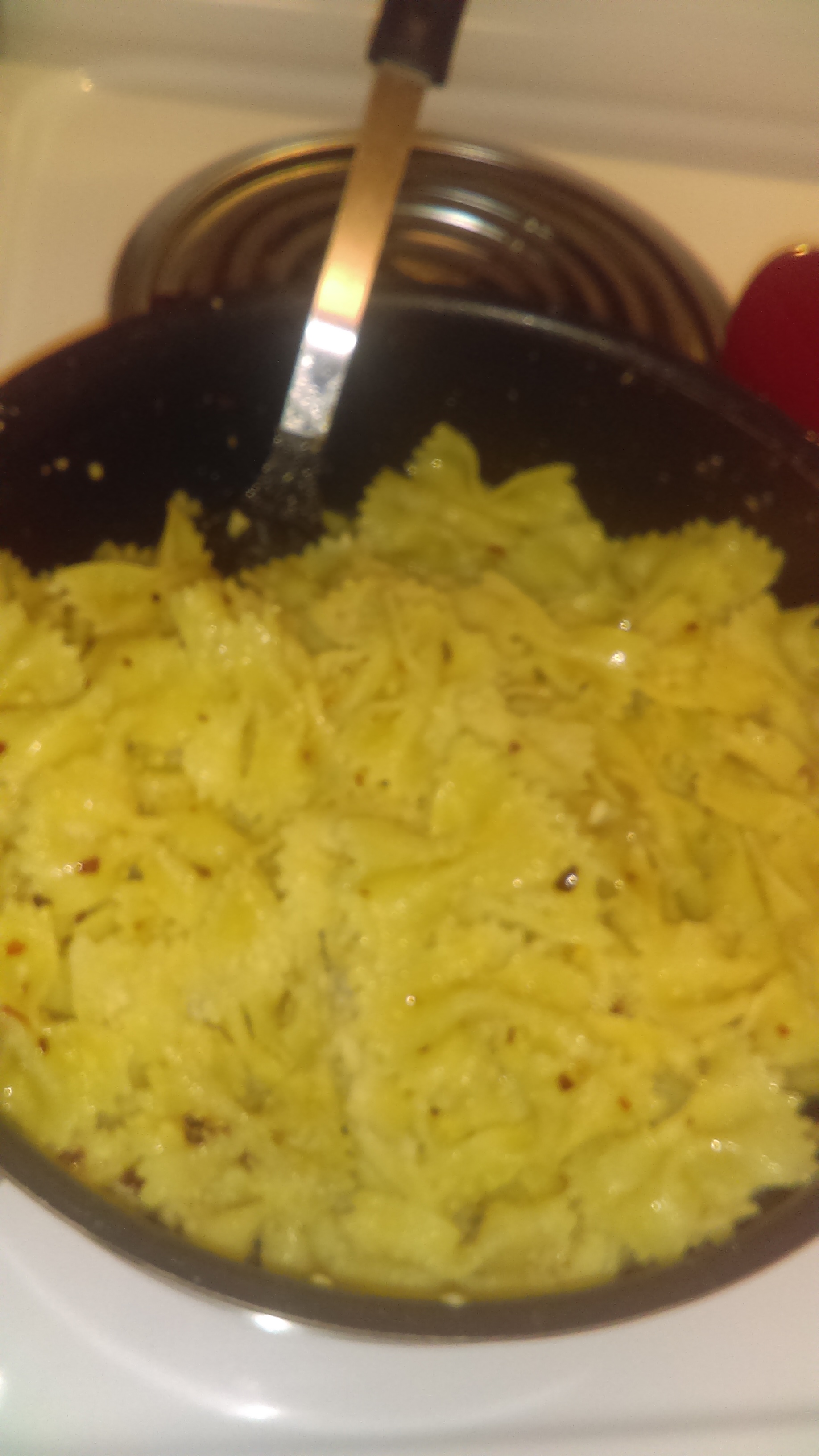 Onto the recipe itself. We didn’t have fettuccine so I used bowtie pasta. Turns out, they are officially called, farfalle. I’m sure that’s the first time I’ve seen that word. I used two tablespoons of garlic, as using a measurement of “half” doesn’t make any sense. I’m sure it means to use a full scoop of whichever measuring spoon and then don’t fill it up nearly as much, the second time. It is garlic, so I did two full tablespoons, as we like garlic.