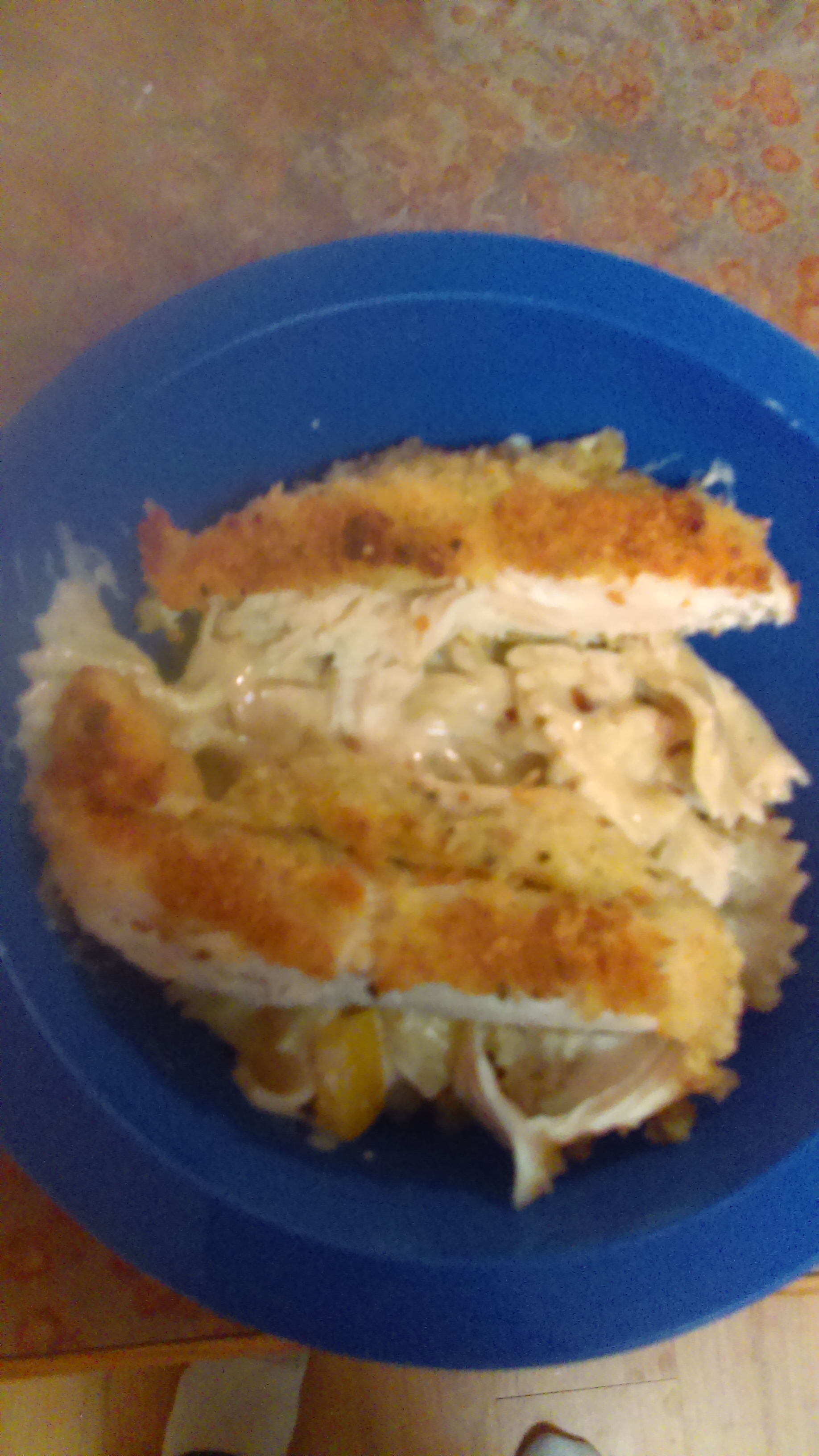 This was another recipe that killed our Parmesan cheese supply. Which reminds me, I used grated cheese for both the chicken and the cream sauce. That’s what we bought, so next time, I will buy shredded Parmesan cheese for the sauce, as I bet that would cause it be thicken up better and be more representative of the original recipe.