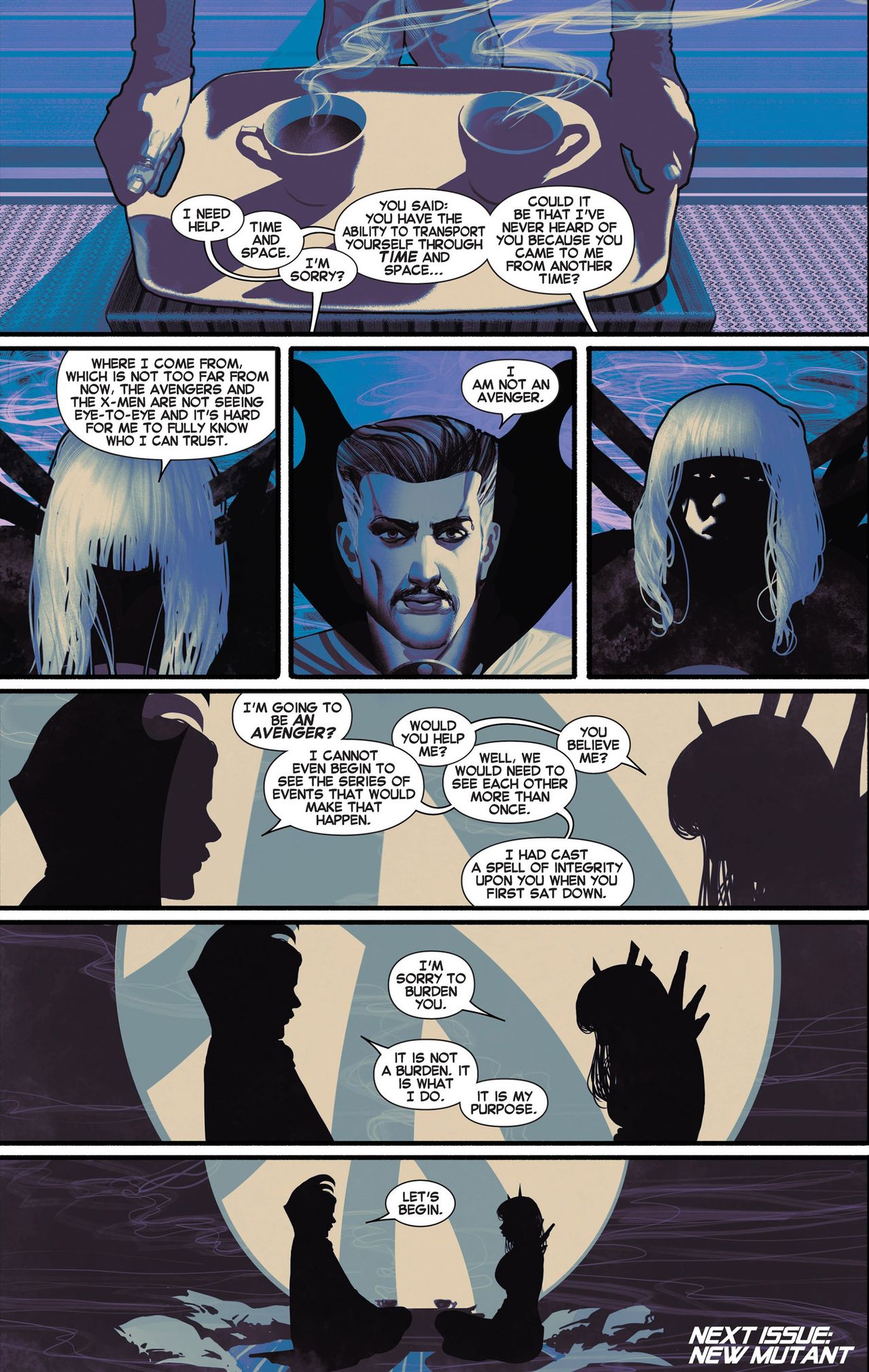 Issue opens with Illyana, speaking to a second party. The other person recognizes the name, Rasputin. The voice does not recognize Illyana. The voice is . . . Doctor Strange! So she must have gone back to way before she ever joined the team, so prior to the original New Mutants run. Strange is willing to listen to her. I love, so much, that Bendis has paired these two characters.