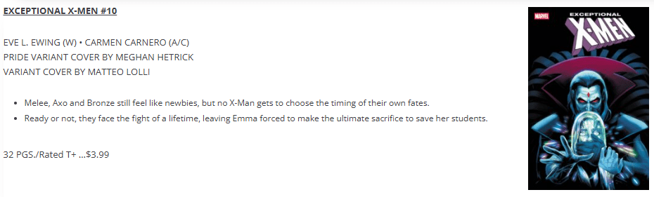 I’ll probably take a chance on the Pride cover being Kitty Pryde focus, as that would be a giant missed opportunity there. Or the Matteo Lolli variant, but I don’t need a Sinister cover.