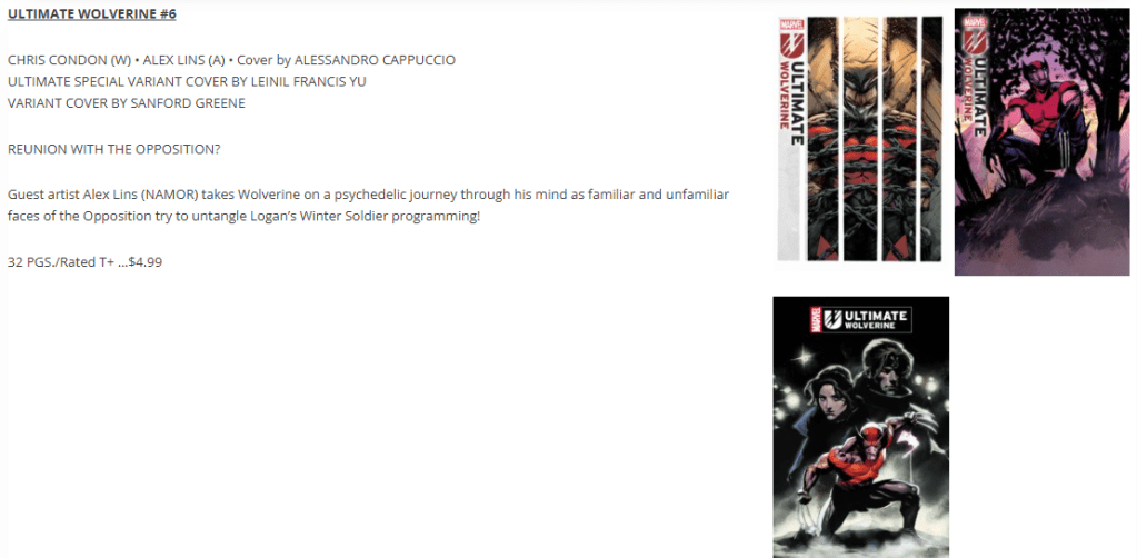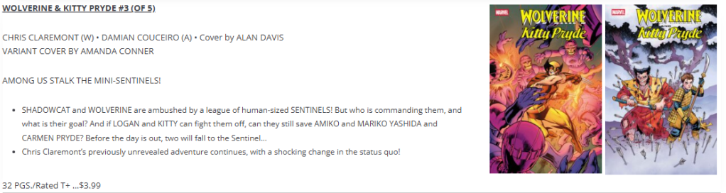 Okay, I might regret not buying issue 5, but I’m a lock for that variant cover with Kitty Pryde and Gambit by Sandford Greene. I’m just so happy to know Ultimate Kitty Pryde survived the third issue! It states they are returning faces, so maybe they are not in the fifth issue?