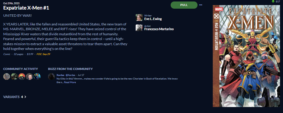 Expatriate X-Men is clearly the Exceptional X-Men title of the crossover, so I’ll commit. Be nice if we knew these were 1 of 4 or just one shots, but I love those Exceptional X-Men members, so I’ll support this series.