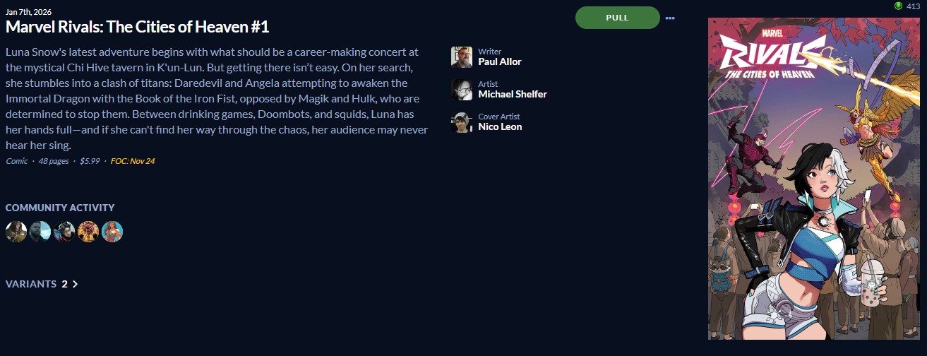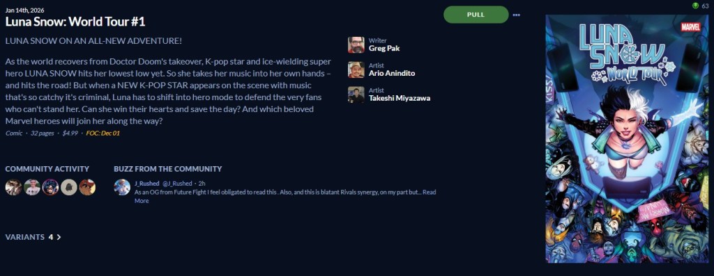Marvel Rivals : The Cities of Heaven 1, reminds me that I haven’t played Marvel Rivals in a couple weeks. Magik and Hulk oppose Luna Snow, who is starting 2026 off with two issues. Pretty impressive, and I’m on board. Hopefully Magik is on one of the two variant covers.