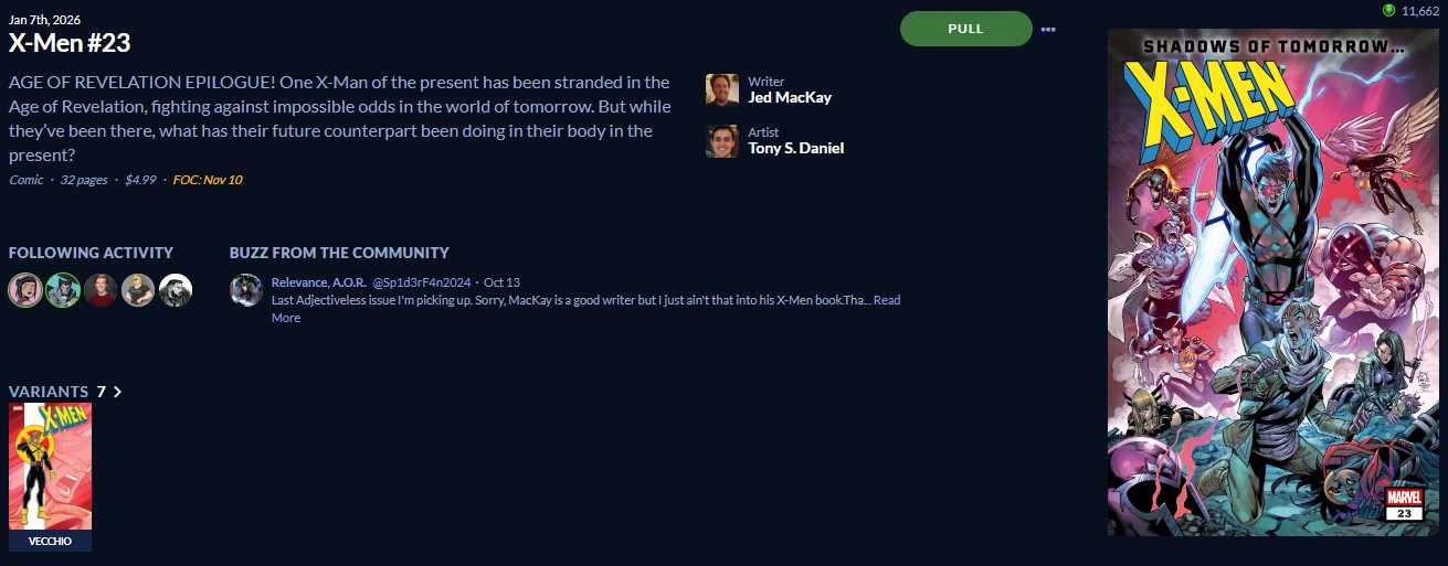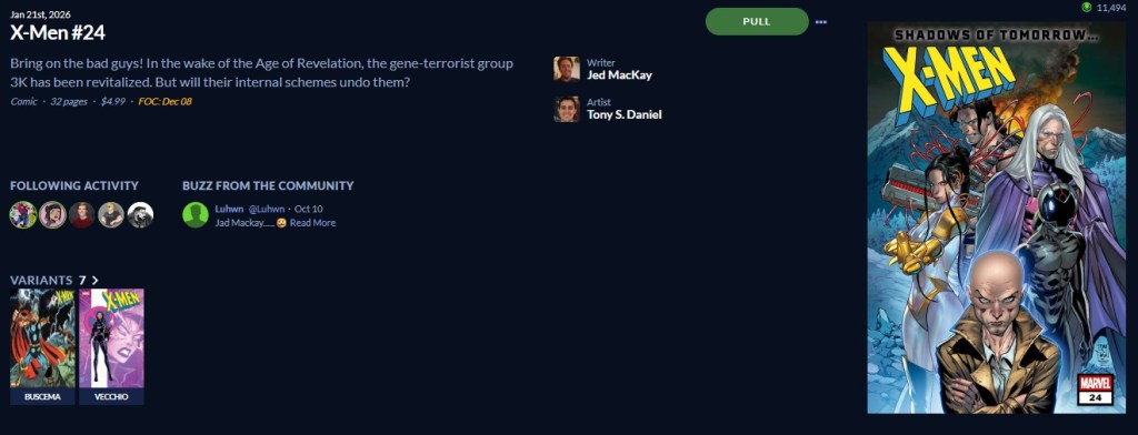 X-Men 24, probably a variant, but not the Thor cover (for some reason is an option), maybe the Vecchio Psylocke variant, if Magik isn’t on one of the other five variants. Hopefully Marvel does a decent job of showing us all of the options before DCBS stops the preorders.