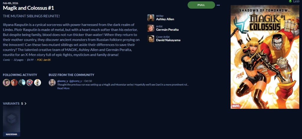 I’m on board for Magik & Colossus 1! I love Ashley Allen, and German Peralta. If there are any solo Magik variant covers, those are the ones I want. But I am looking forward to giving Colossus the much needed restart that he needs.