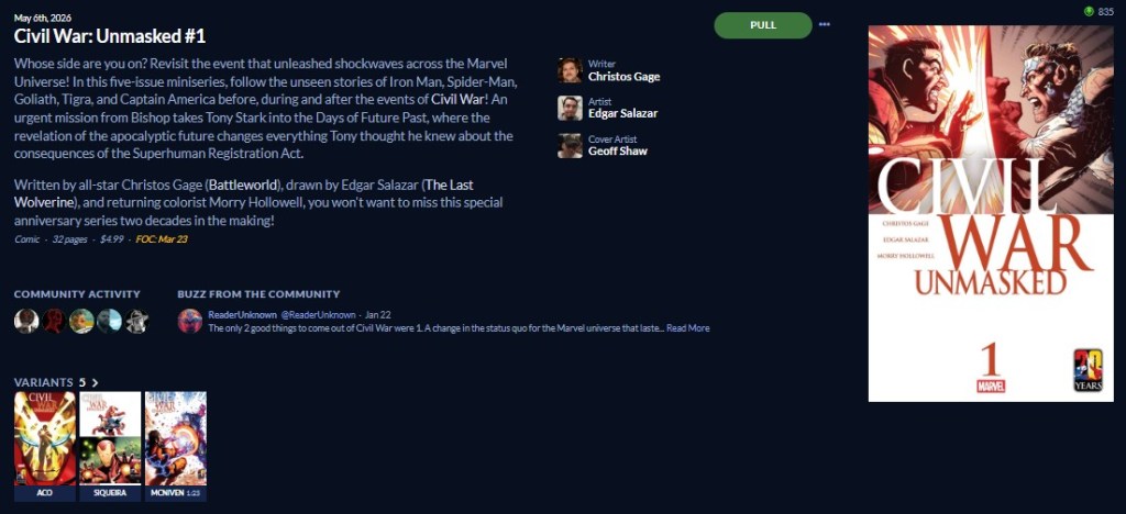 Civil War Unmasked 1, this was originally a hard pass for me, but Bishop and the Days of Future Past (which isn’t his future) has me interested in the first issue at all.