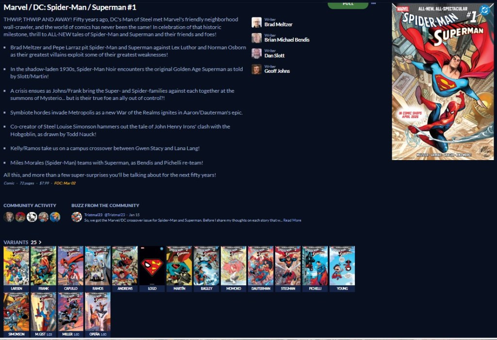 weird Spider-Man / Superman is being promoted again. If you use DCBS, this is available now to order, so you better hurry! Don’t wait until March. I’m getting the Erik Larsen Cyborg Spider-Man Superman cover, and Walker D is getting the everyone cover.