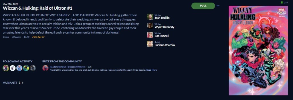 Wiccan & Hulking : Raid of Ultron 1, is Marvel’s Pride issue. It has three variant covers, so hopefully Kitty shows up on one of those.