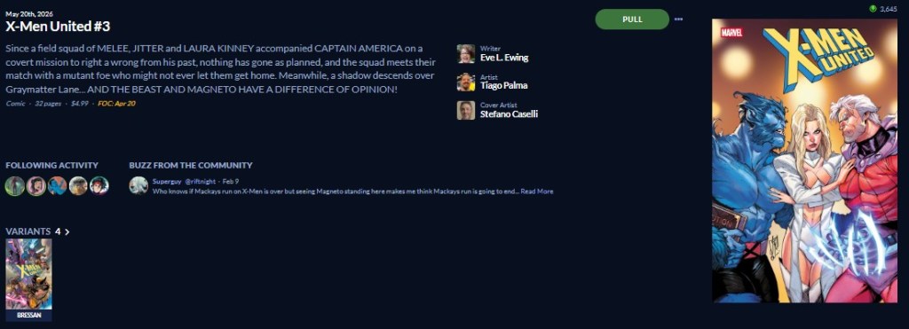 X-Men United 3, I’m getting Andrei Bressan’s variant cover for sure, it has Magik on it.