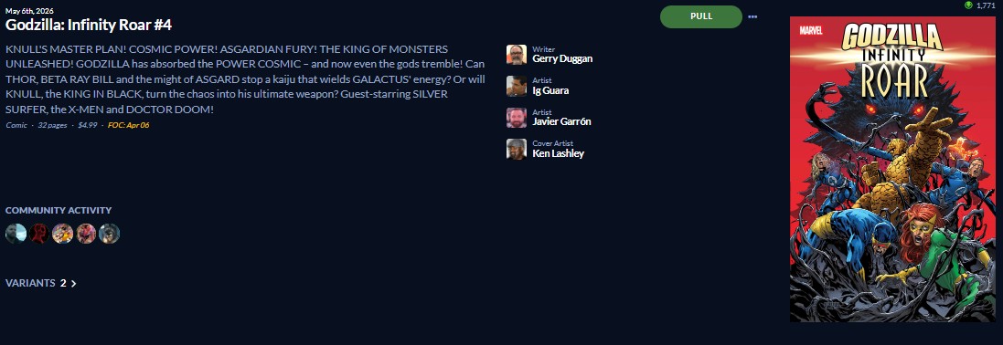 Godzilla Infinity Roar 4, mentions the X-Men appearing in it, with Cyclops and Jean on the cover. Magik was in the last issues of the previous miniseries, so I’ll probably get this, and keep checking for variant covers.