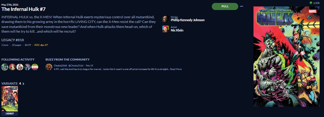 Infernal Hulk 7 kicks off a X-Men arc, so I might be buying this for a while. Magik on the regular cover, so I’m loving that.