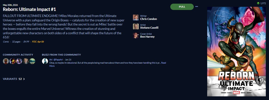 Though writing that, I am still buying into the hype with Reborn : Ultimate Impact 1. Now the Ultimate Universe is maybe done, but the 616 universe is now involved, gets my interest. Plus, it promises to reveal some new major characters (that I’m sure we’ll forget all but two of them in three years)