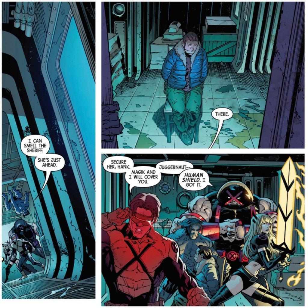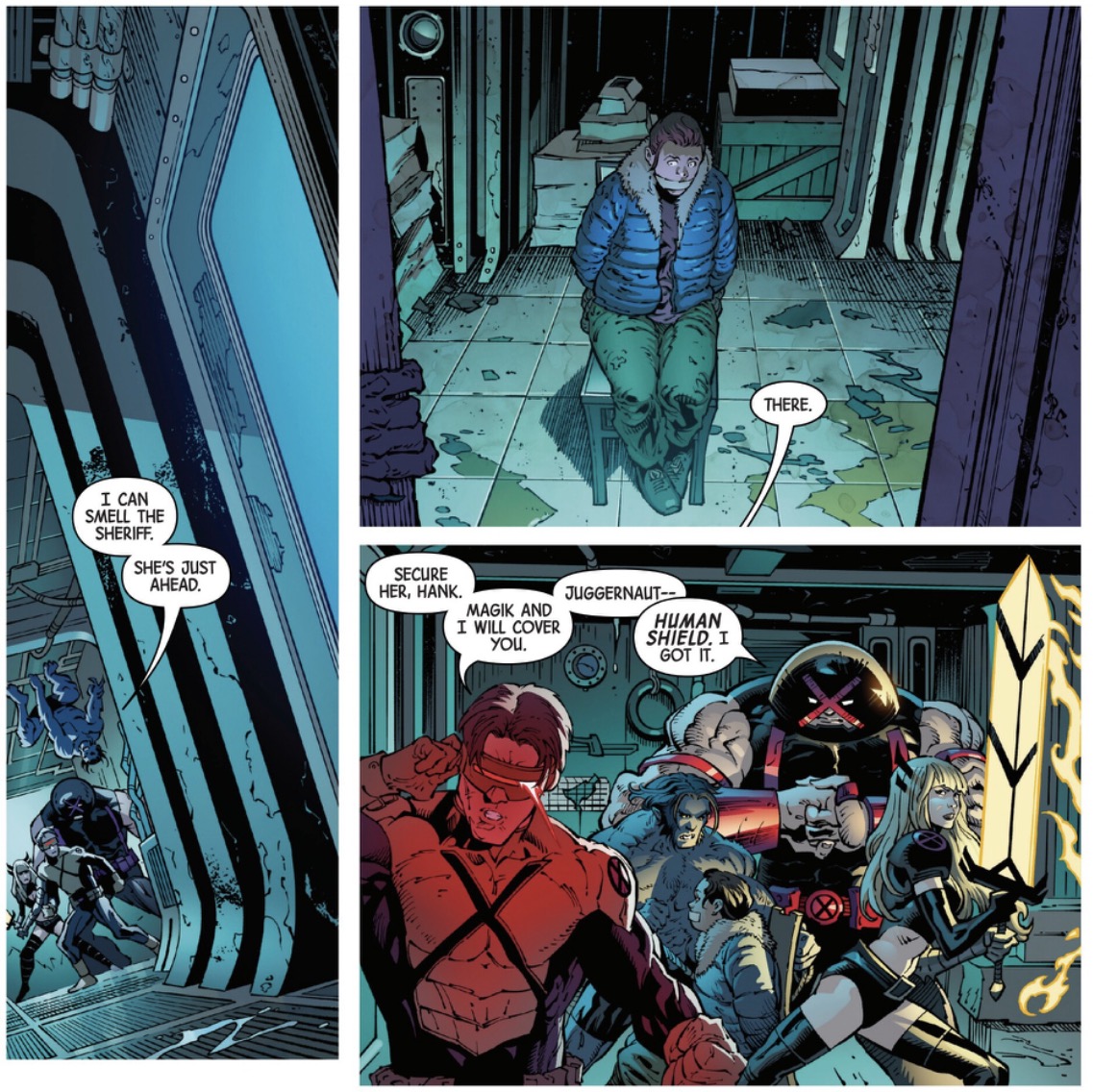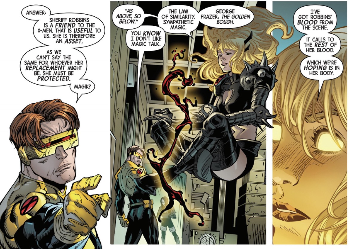 Cyclops asks Magik to track Sheriff Robbins’ blood to the source.