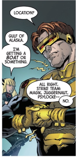 Psylocke can’t make the mission as she has to check on Greycrow. Cyclops tells her to take Xorn with her, as Greycrow will need a healer. That’s nice of him.
