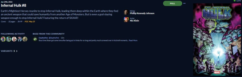 Godzilla Infinity Roar 5, Doctor Doom is involved, as is Mecha-Godzilla (who I love), and I do appreciate them listing actual characters appearing in this – Human Torch, Miles Morales, Man-Thing, Kang, and Ghost Rider. There are two unseen variant covers, so I’ll check those variant covers. I feel like I can take a chance, and not buy this.