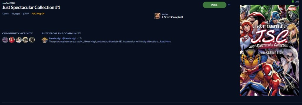 J. Scott Campbell’s variant cover collection Just Spectacular Collection (get it?) will have a page for his Magik cover. I love the idea of this one shot, and Marvel should do these more often. Once Russell Dauterman does a Kitty Pryde costume gallery cover, they should print all of those issues in a comic.