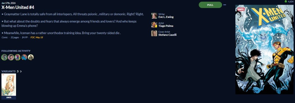 No Kitty reference in X-Men United 4. She’s not on any of the two of six covers, so I’ll have to keep checking for which variant cover I want.