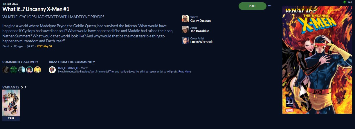 What If Scott Summers Stayed with his wife, and mother of his child, Madelyne Pryor? This has potential to launch its own complete line. I’m buying this as I can only imagine we’ll see Kitty Pryde and Lockheed when they cut to the X-Men. Hopefully they are on one of the unseen four variant covers.