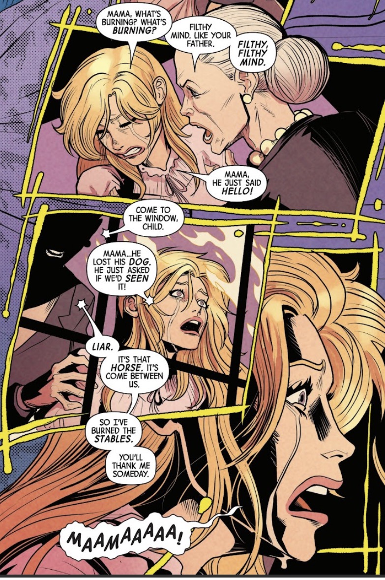 Calico is having a nightmare. I do NOT like her mother, at all. A boy asked Becca about a lost dog, and her mother is just losing it. She claims Becca has a filthy mind just like Becca’s father, and anyone who uses the phrase “filthy mind” just isn’t right. Somehow Ember is next on the hitlist, Becca’s mother thinks the horse is coming between them, so naturally, she burned the stables. The heck?!