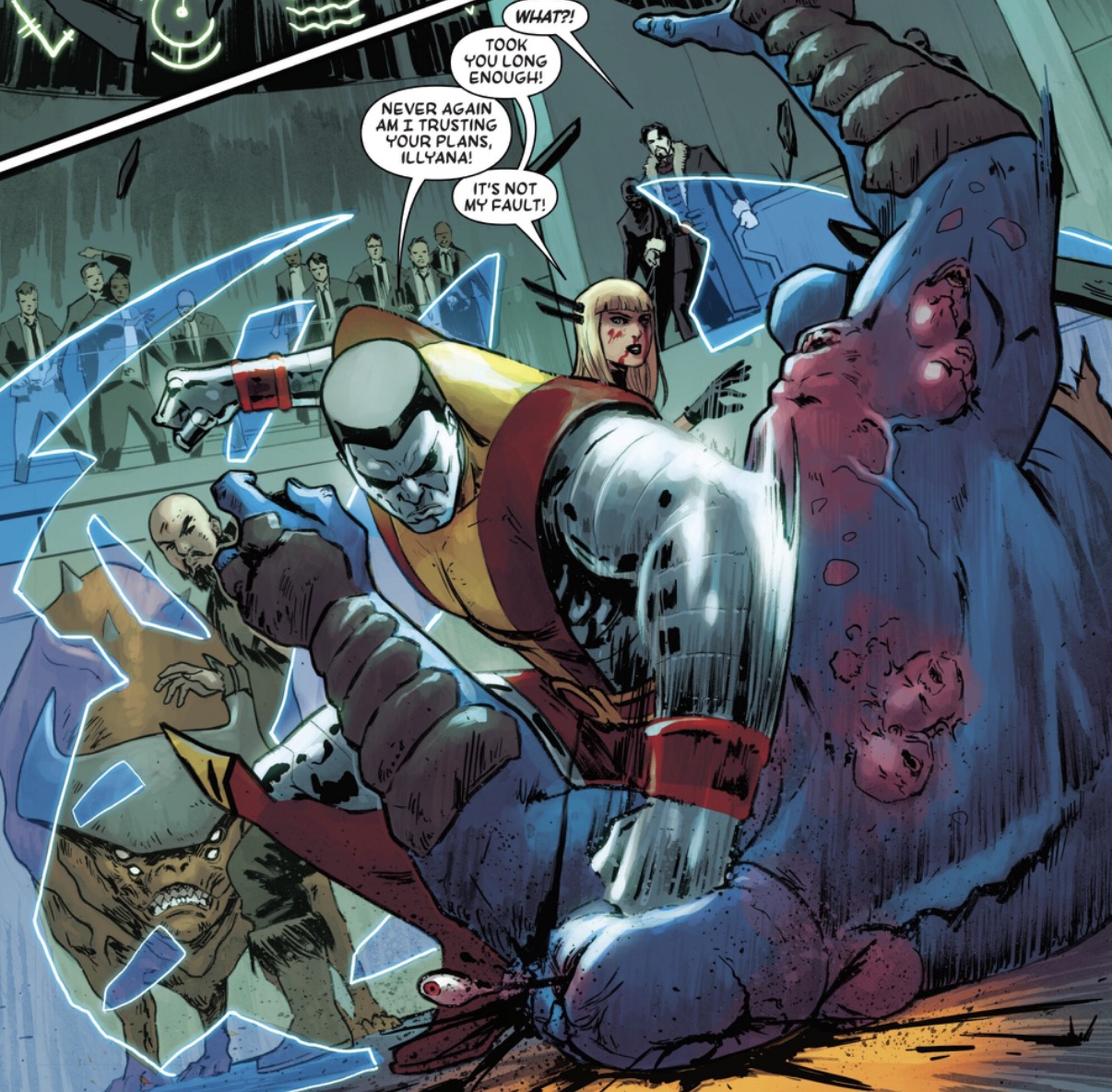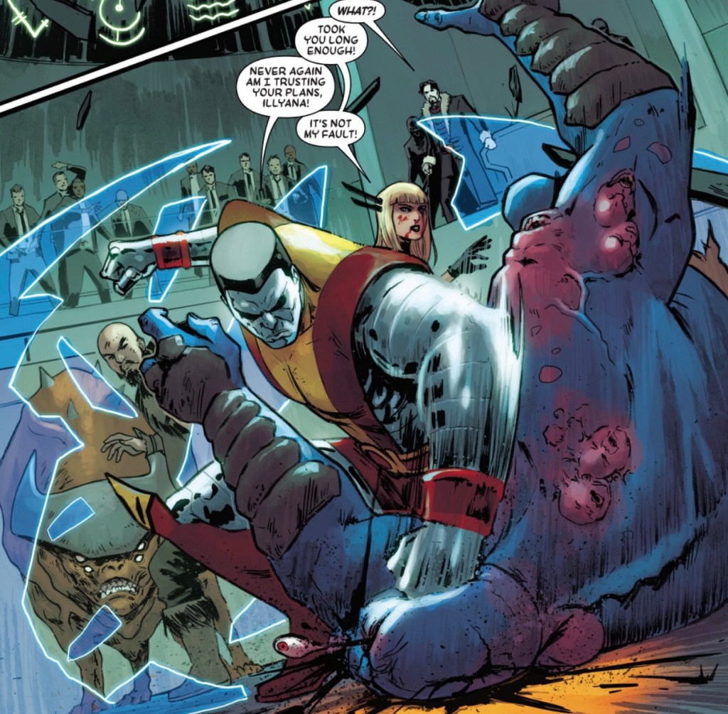 I like how smart Illyana is, that she knows that’s the plan, so she’s just punching and kicking goons, and doing quite well for herself.