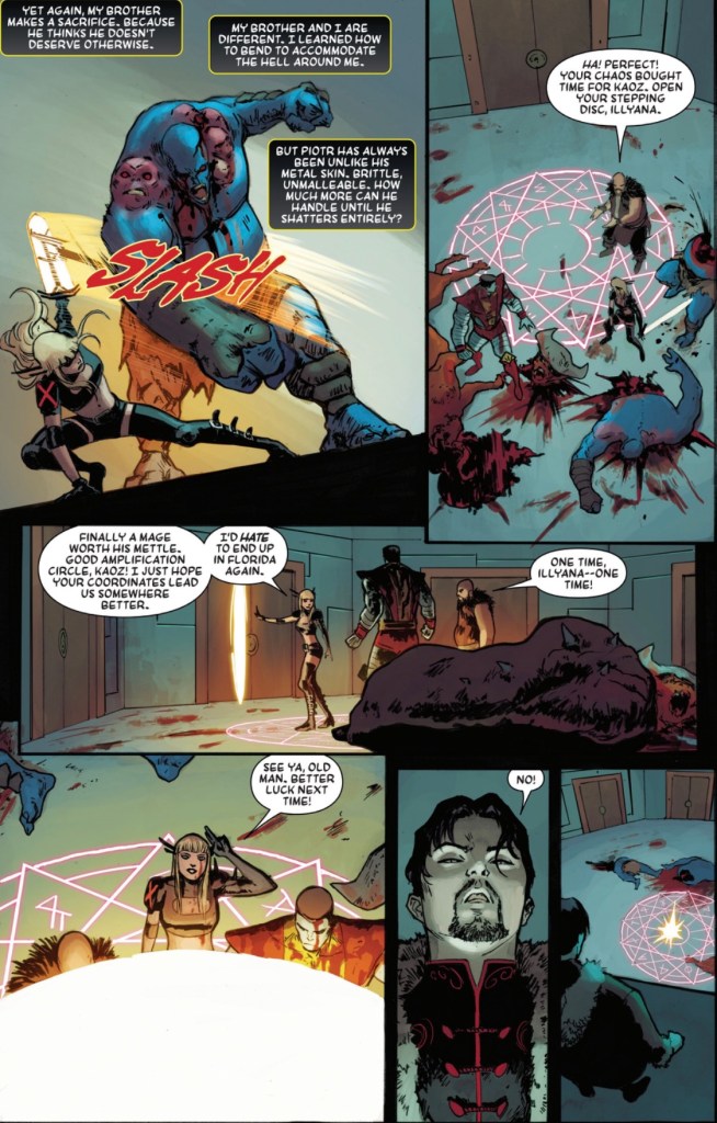 Colossus breaks through the barrier, and starts helping out. Did I need four pages of Colossus getting closer to Magik? No, show us that he’s on the right track, and then surprise us with the reveal. That’s such great pacing.
