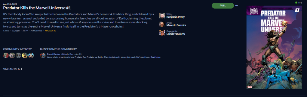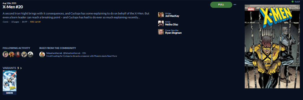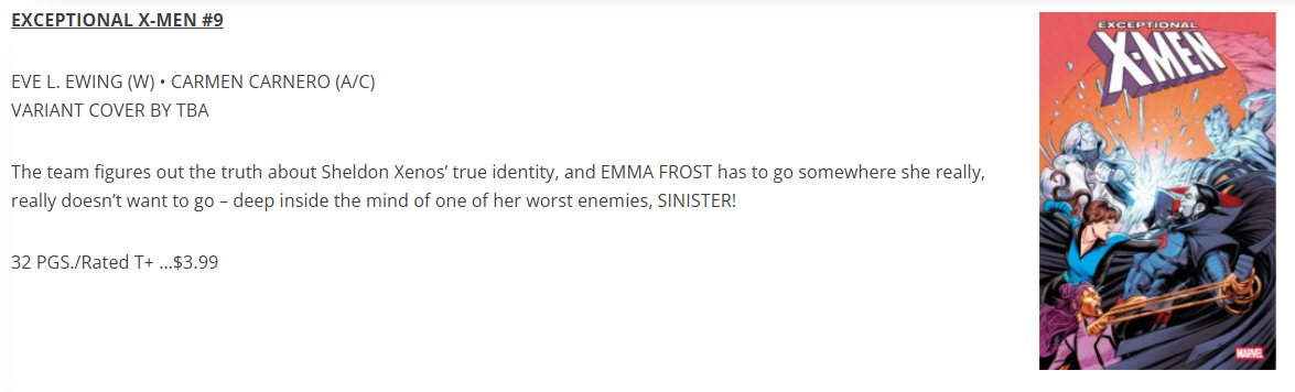 I’ll probably take a chance on the Pride cover being Kitty Pryde focus, as that would be a giant missed opportunity there. Or the Matteo Lolli variant, but I don’t need a Sinister cover. I wonder what Emma will sacrifice?! Probably not great timing we’re getting a villain miniseries from her right now.