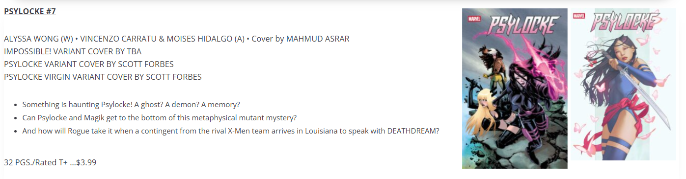 X-Men 24, probably a variant, but not the Thor cover (for some reason is an option), maybe the Vecchio Psylocke variant, if Magik isn’t on one of the other five variants. Hopefully Marvel does a decent job of showing us all of the options before DCBS stops the preorders.