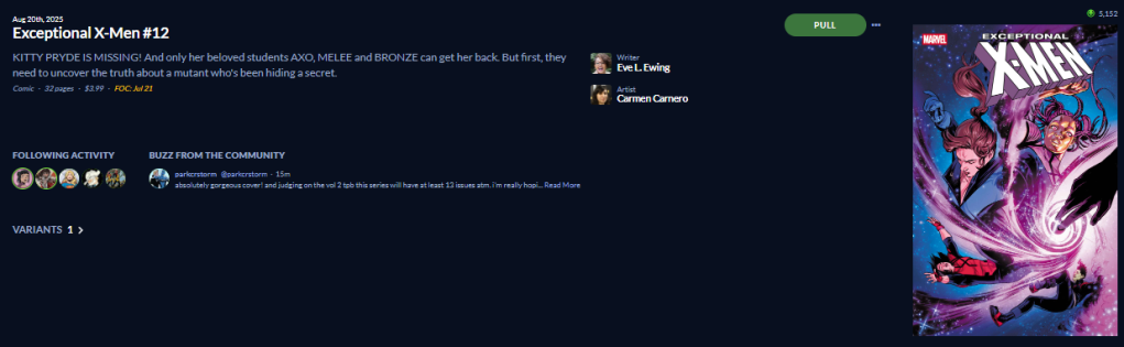 Exceptional X-Men 9, and maybe I get both covers? I’ll see what my total is.