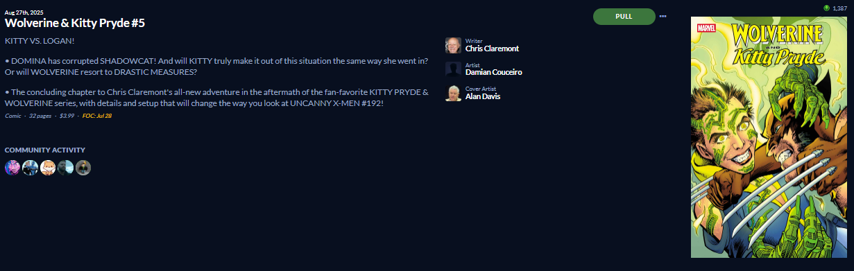 Book of Revelation 3, of 3, we do see the Spirit of Philadelphia on the main cover, and Marvel has all but confirmed that is Kitty, so I’ll commit to finishing the series.