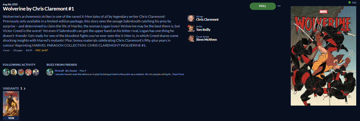 If the Amanda Conner cover is reasonably price, I’m getting that one. Might be my first cover of hers. I don’t need another solo Wolverine cover. I wonder what status quo can Claremont be changing in a retro series?