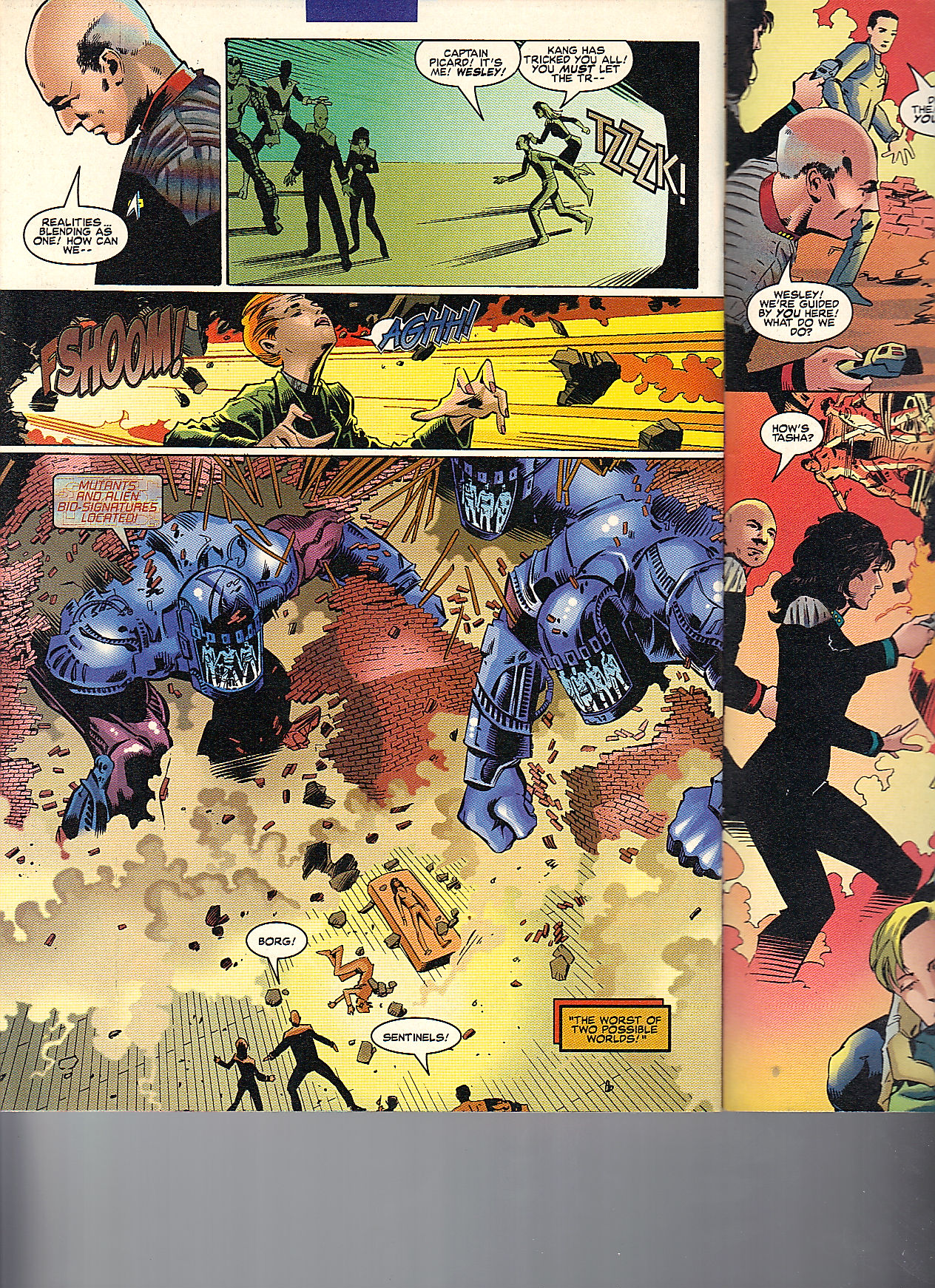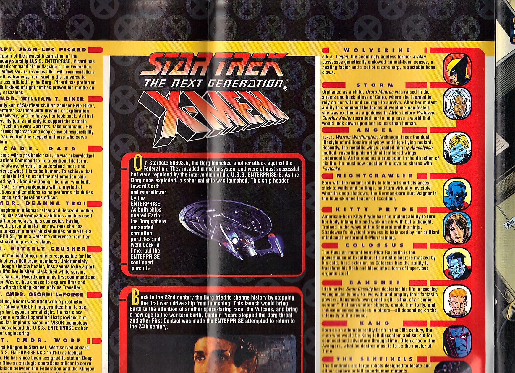 Star Trek : Next Generation : Captain Jean-Luc Picard, Commander William T. Rider, Commander Data, Commander Deanna Troi, Dr. Beverly Crusher, Lt. Commander Geordi LaForge, Lt. Commoner Worf and the Borg. X-Men : Wolverine, Storm, Angel, Nightcrawler, Kitty Pryde, Colossus, Banshee, Kang, Sentinels and the Thunderbolts.