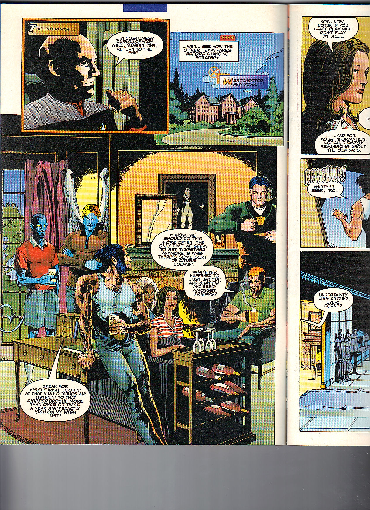 Troi gets between the boyz and quickly explains that they are from the Enterprise. Wolverine recognizes the name of the starship from the previous teamup.