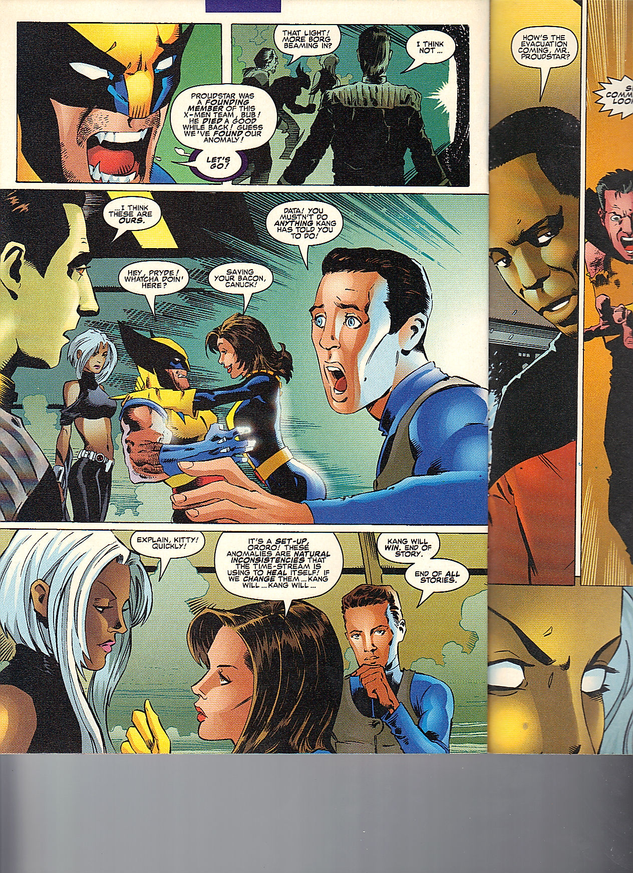 Wolverine is about to kill Thunderbird (as he’s better than Count Nefaria, I guess). Luckily, Kitty arrives and hugs Wolverine. Wesley is forced to yell at Data to not do anything that Kang told them to do. Storm wants an explanation, I would have just taken Kitty at her word. I’m good like that.