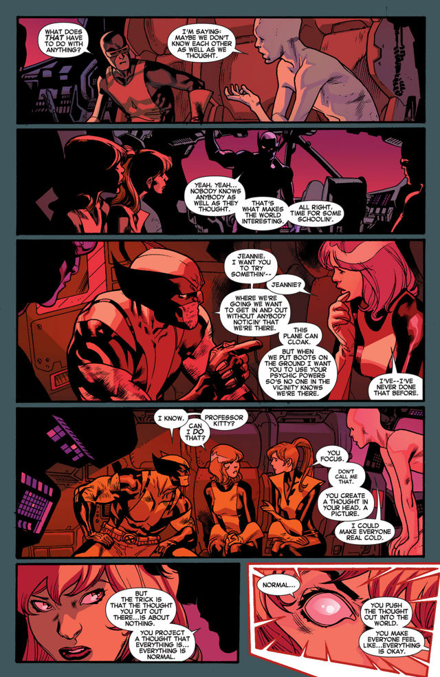 Jean mind rapes the information from Bobby. Mind you, she and Bobby have never been close. They are not complete strangers but they are not close at all. Jean may be a tad closer to Warren. She’s always been close to Hank and Scott. I do like how All New Bobby and Scott were getting close. If someone was going to tell this story, I would have had Bobby come out to Scott. Like a scene where Bobby is updating Scott on everything that they did, and then end it with how he is preparing to come out as a homosexual. Bendis choose to go this route, as Jean is the star of this title and she needs to get all the big moments.