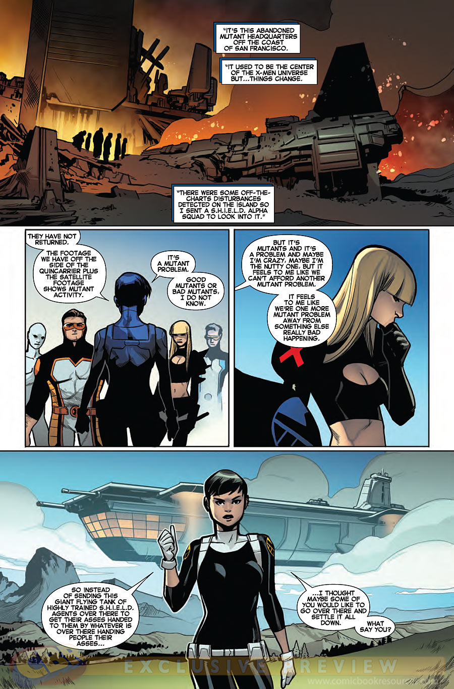 Utopia Island. Former Home of the X-Men, San Francisco Bay. A group of salvagers have arrived on the island. They suspect that the X-Men left behind a slew of valuables when they left the island nation. They suspect that the Avengers nor SHIELD has had the time to go back and pick up those islands. Which is odd, as SHIELD clearly has enough soldiers employed that can go to locations like Utopia and start grabbing important pieces of equipment.
