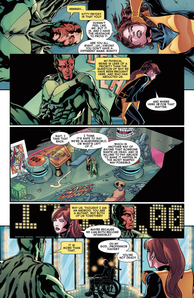 It was going to allow Vision to infect it with the techno virus. Kitty is quick to point out that if Vision did, the two heroes would be dead right now. As MurderWorld has them hooked up to computers at the moment. That is why they can’t phase, they are inside a program.