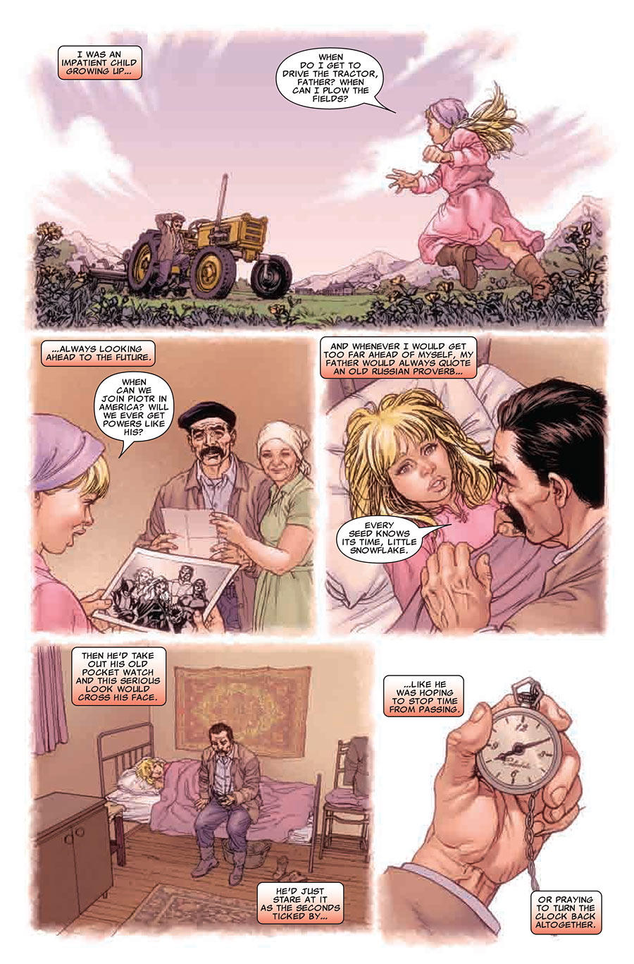 Colossus thinks back to Serbia, how the harsh winters would cover the beauty of Mother Russia. We get Oeming drawing a young Illyana, when she was happy.