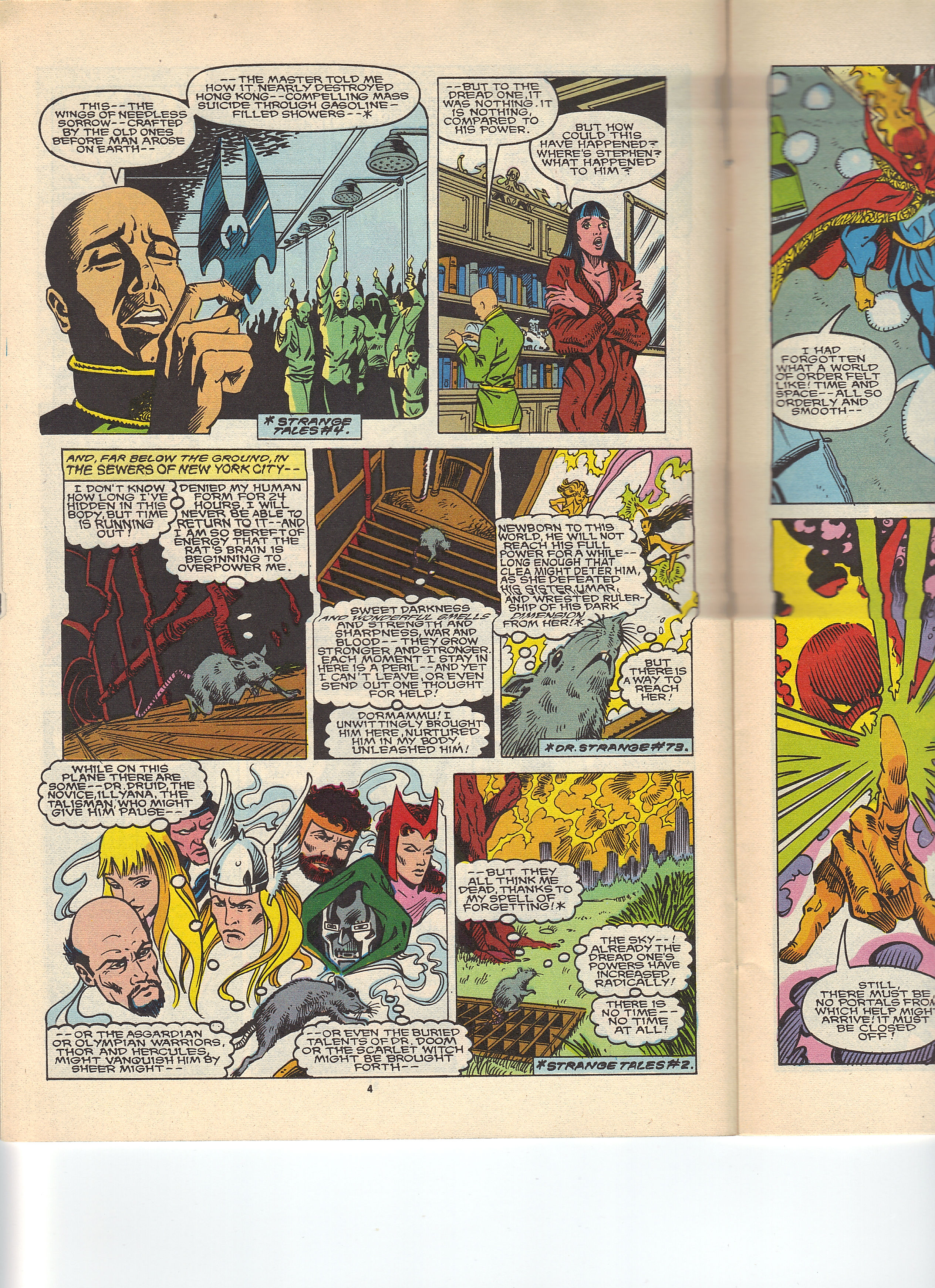 The frogs agree to help Strange, they move some sticks around. Strange summons Gaea but all he senses is that she is weak. The footnote states to see recent issues of the X-Men. I wish they named the issue as well, as now that it is 25 years later, I am not sure which issue that is referencing. This is also the footnote that this will be the last footnote.